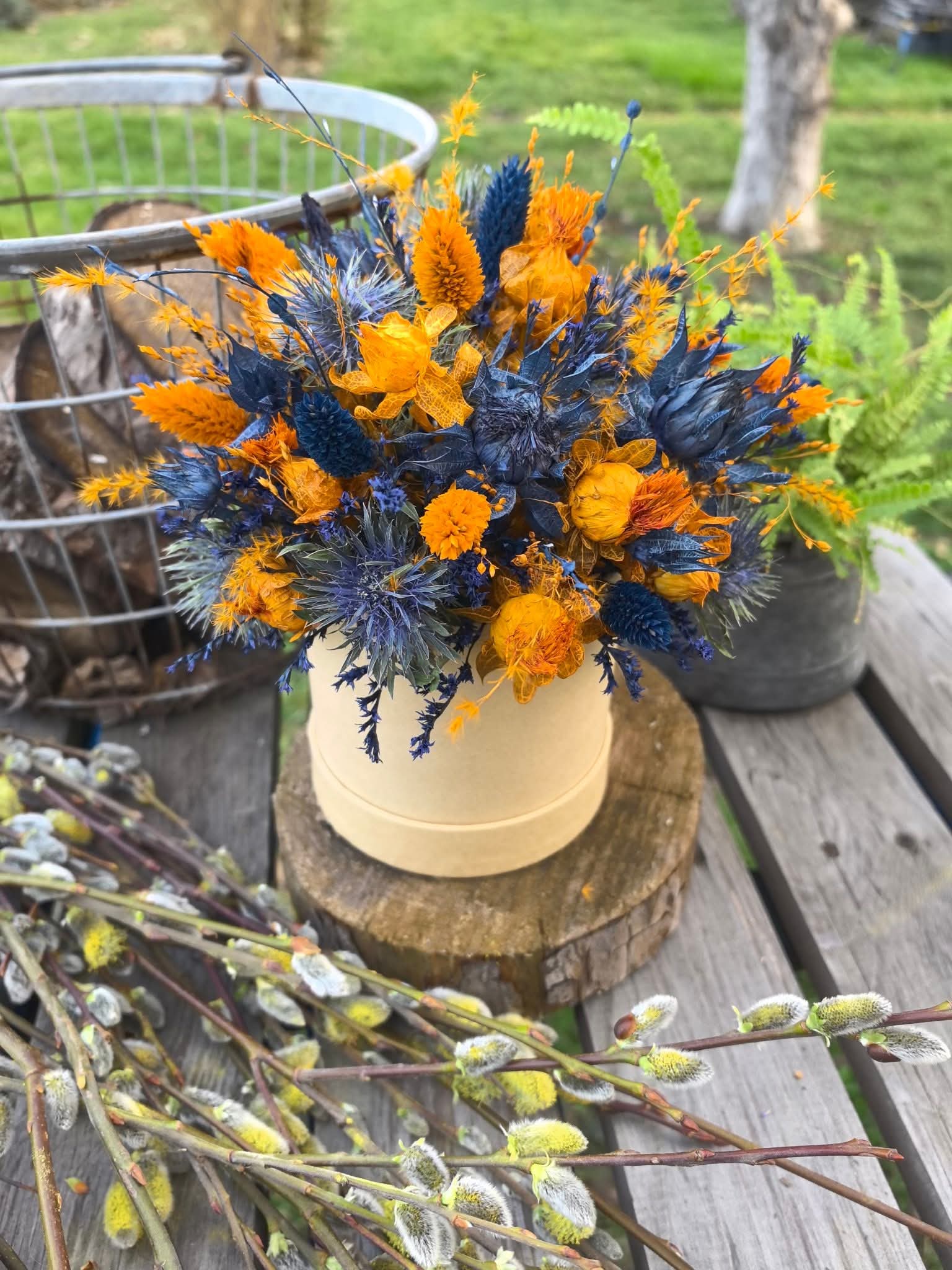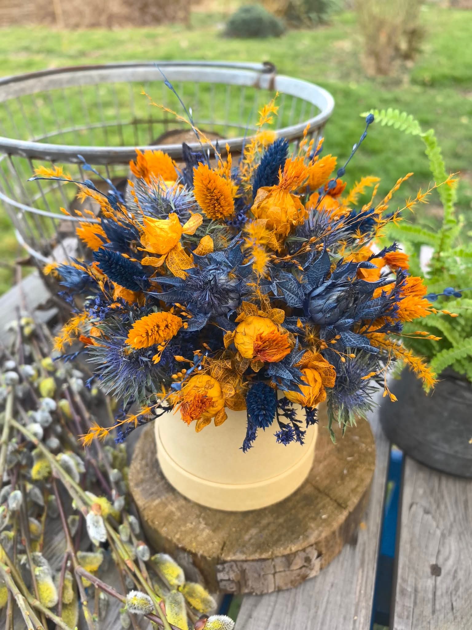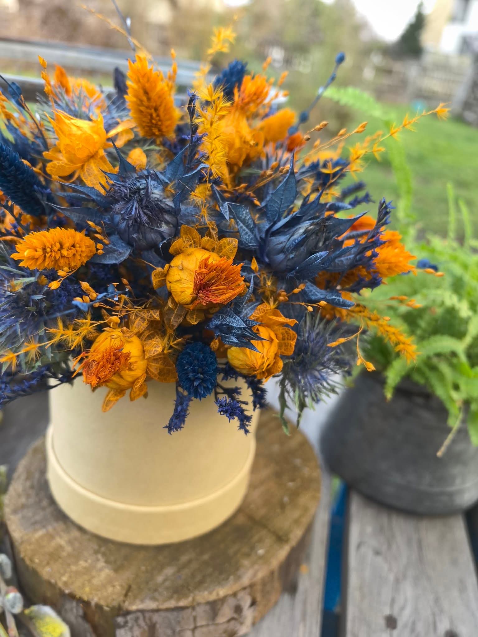🌞🌿 Flower Box w naturalnym, papierowym pudełku, wypełniony kontrastującą harmonią barw – ciepłe odcienie złocistej pomarańczy przeplatają się z głębokim granatem i błękitem, tworząc dynamiczną, pełną energii kompozycję. Suszone kwiaty o słonecznych tonach przyciągają wzrok, a intensywnie niebieski mikołajek dodaje wyrazistości i charakteru. Delikatne trawy i drobne kwiaty nadają całości lekkości, tworząc kompozycję inspirowaną naturą. 🧡💙