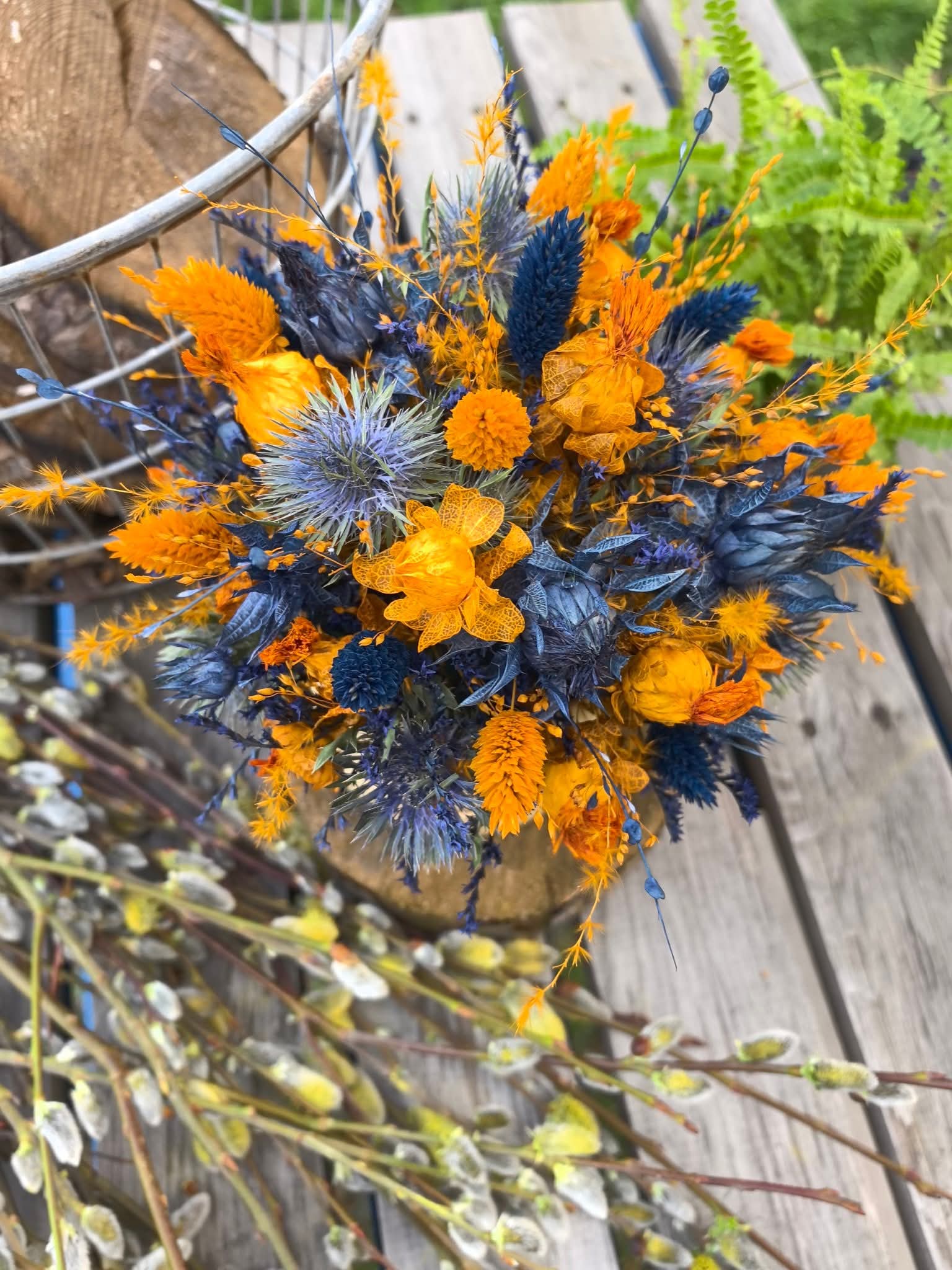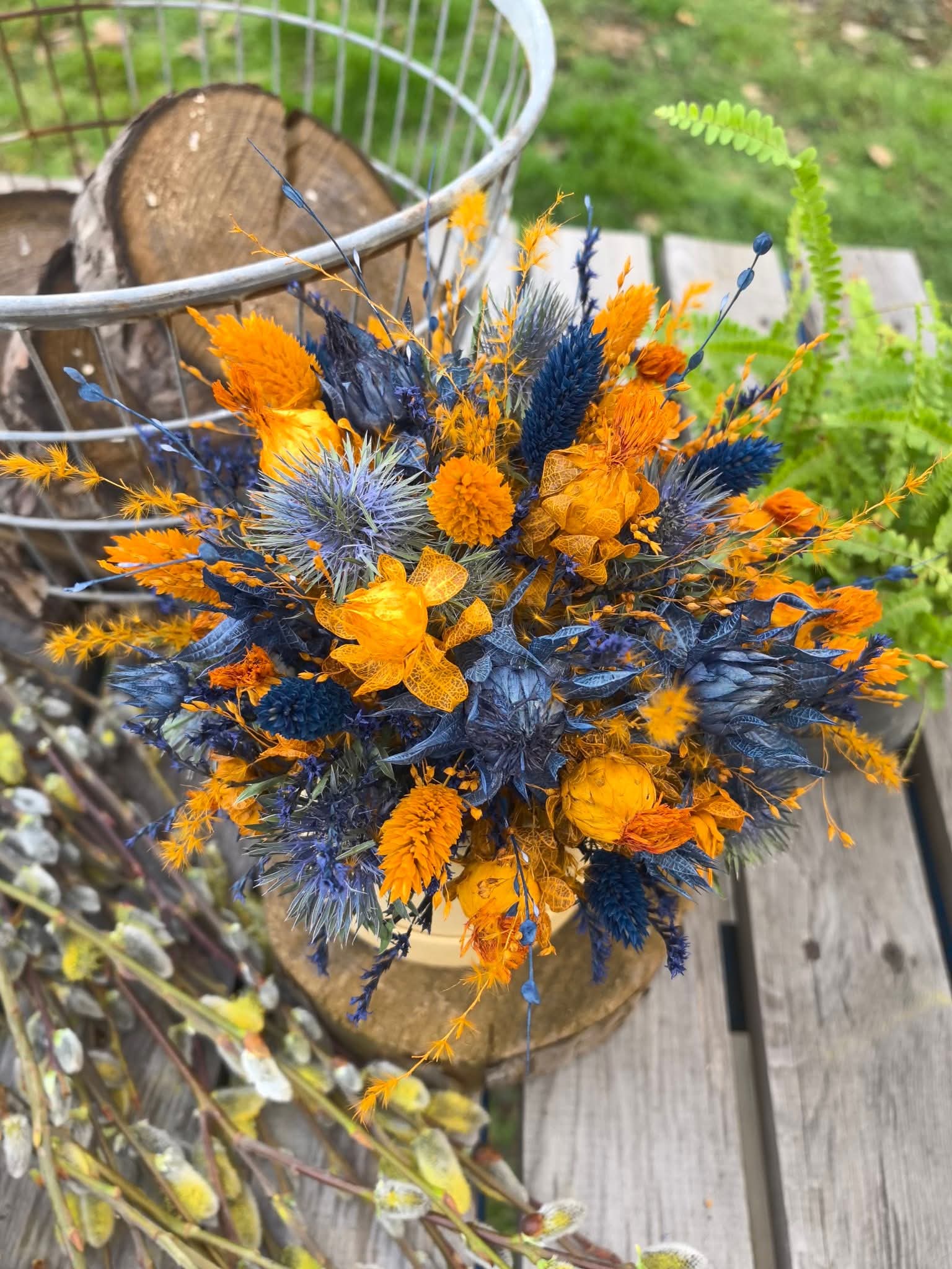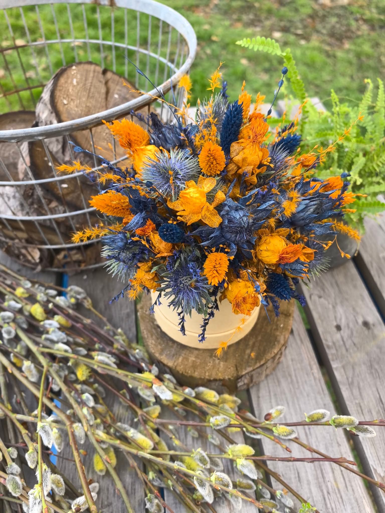 🌞🌿 Flower Box w naturalnym, papierowym pudełku, wypełniony kontrastującą harmonią barw – ciepłe odcienie złocistej pomarańczy przeplatają się z głębokim granatem i błękitem, tworząc dynamiczną, pełną energii kompozycję. Suszone kwiaty o słonecznych tonach przyciągają wzrok, a intensywnie niebieski mikołajek dodaje wyrazistości i charakteru. Delikatne trawy i drobne kwiaty nadają całości lekkości, tworząc kompozycję inspirowaną naturą. 🧡💙