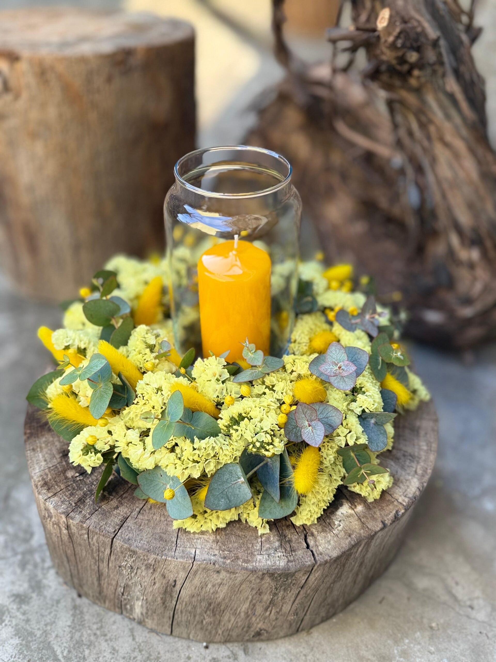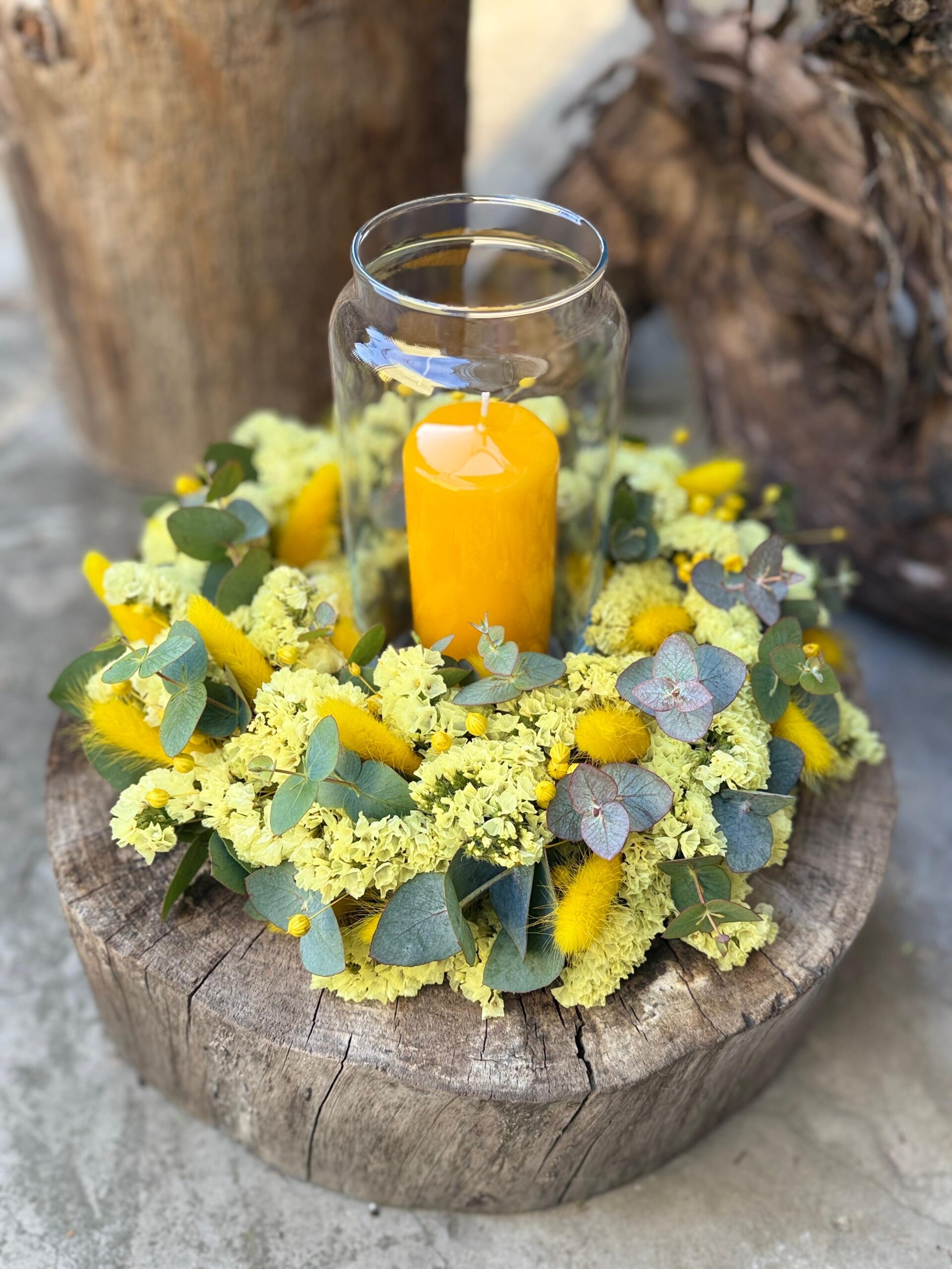 W centrum znajduje się szklany lampion z żółtą świecą, która po zapaleniu otula całość miękkim, przytulnym światłem. Wokół niej ułożone zostały drobne, jasnożółte kwiaty, tworzące lekką i harmonijną bazę. Kompozycję dopełniają gałązki eukaliptusa o subtelnym, chłodnym odcieniu zieleni oraz puszyste, intensywnie żółte akcenty, które dodają jej energii i charakteru.